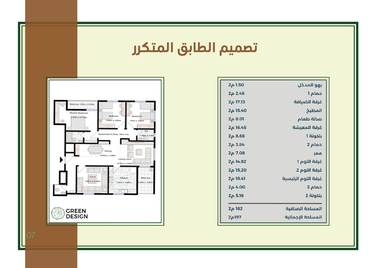 مساحة الشقة الإجمالية 197 م2 ومساحتها الصافية 182 م2، تتكون هذه الشقق من 4 غرف ومطبخ واسع بالإضافة إلى 3 عدد حمام وبلكونتين كبيرة، أضف إلى ذلك انه تم استغلال الارتداد الخاص بالدور الأرضي وإضافته كميزة لشقق الدور الأرضي بحيث اصبح جزء كبير من الارتداد عائد على شقة الدور الأرضي ومن الممكن استغلالها كمنطقة للجلوس أو مكان شواء أو غيره.