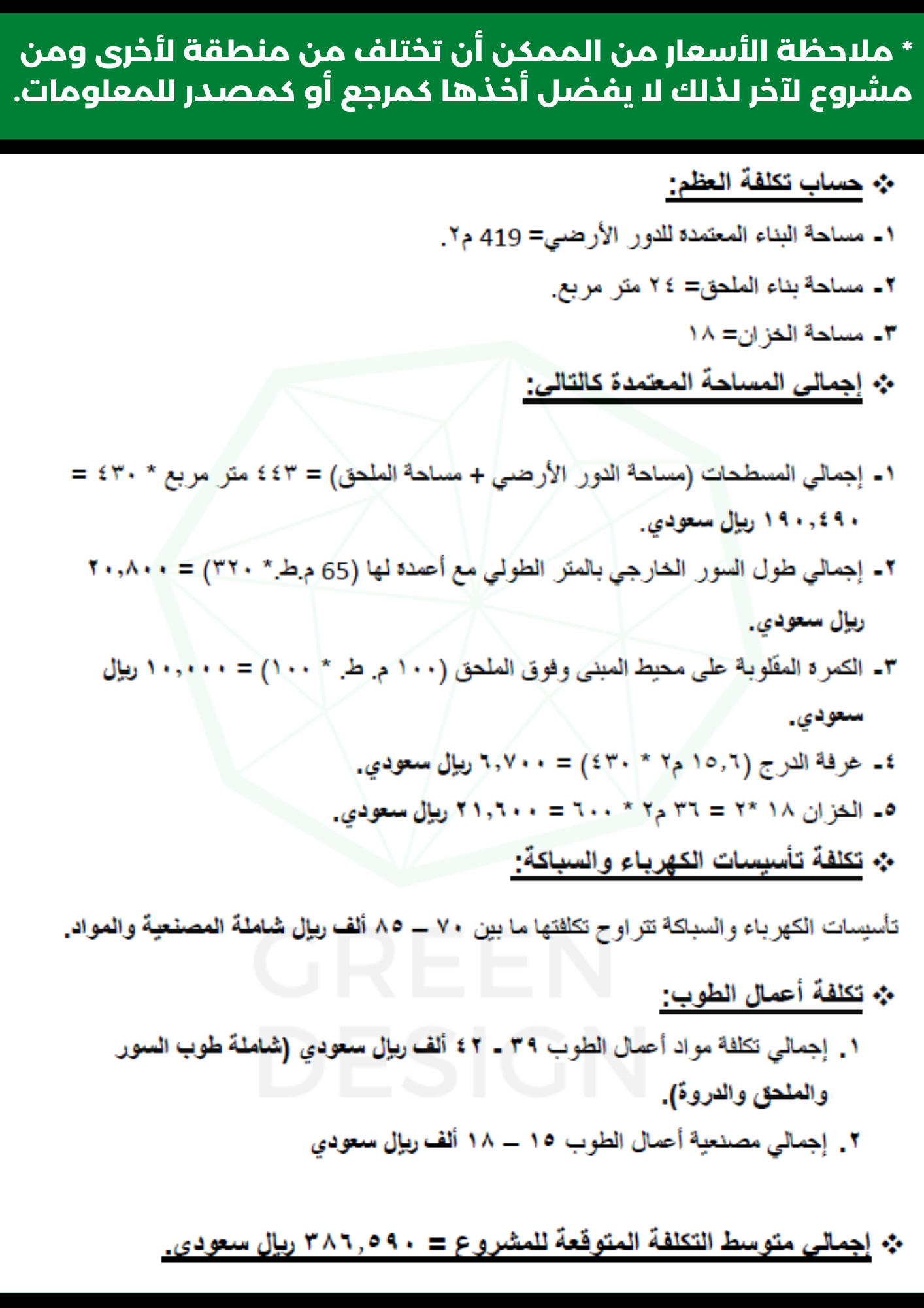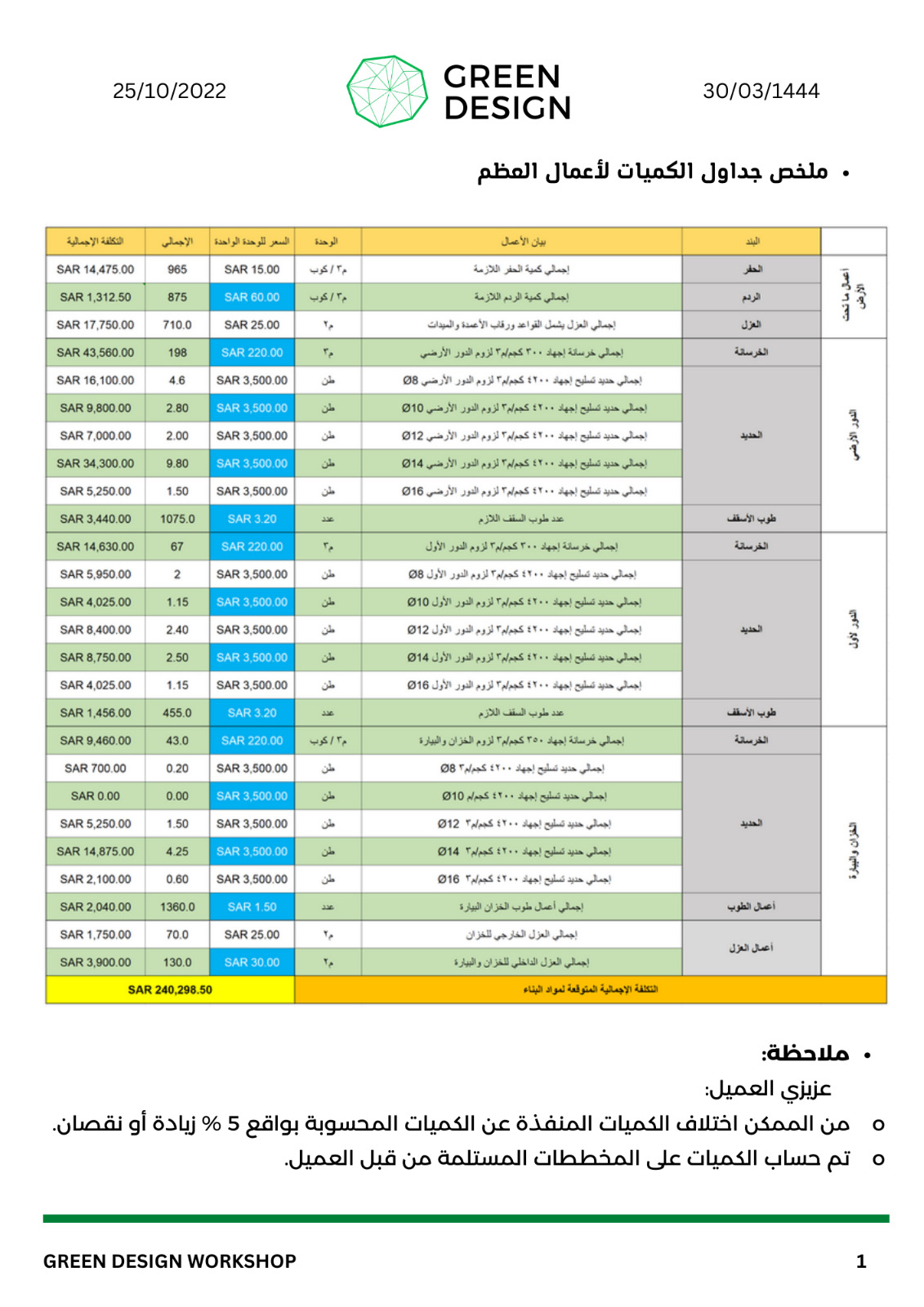 وقد أعد مكتب التصميم الأخضر عدد كبير جدا من جداول الكميات التي كانت مرجع لأصحاب المشاريع في التأكد من الكميات المطلوبة وبالتالي حفظ حقوق المالك والمقاولين والموردين للمشروع