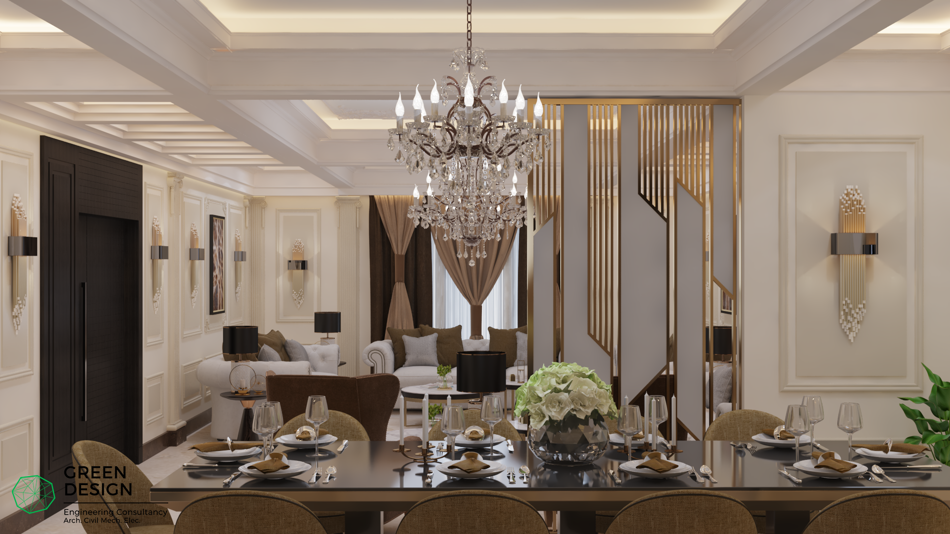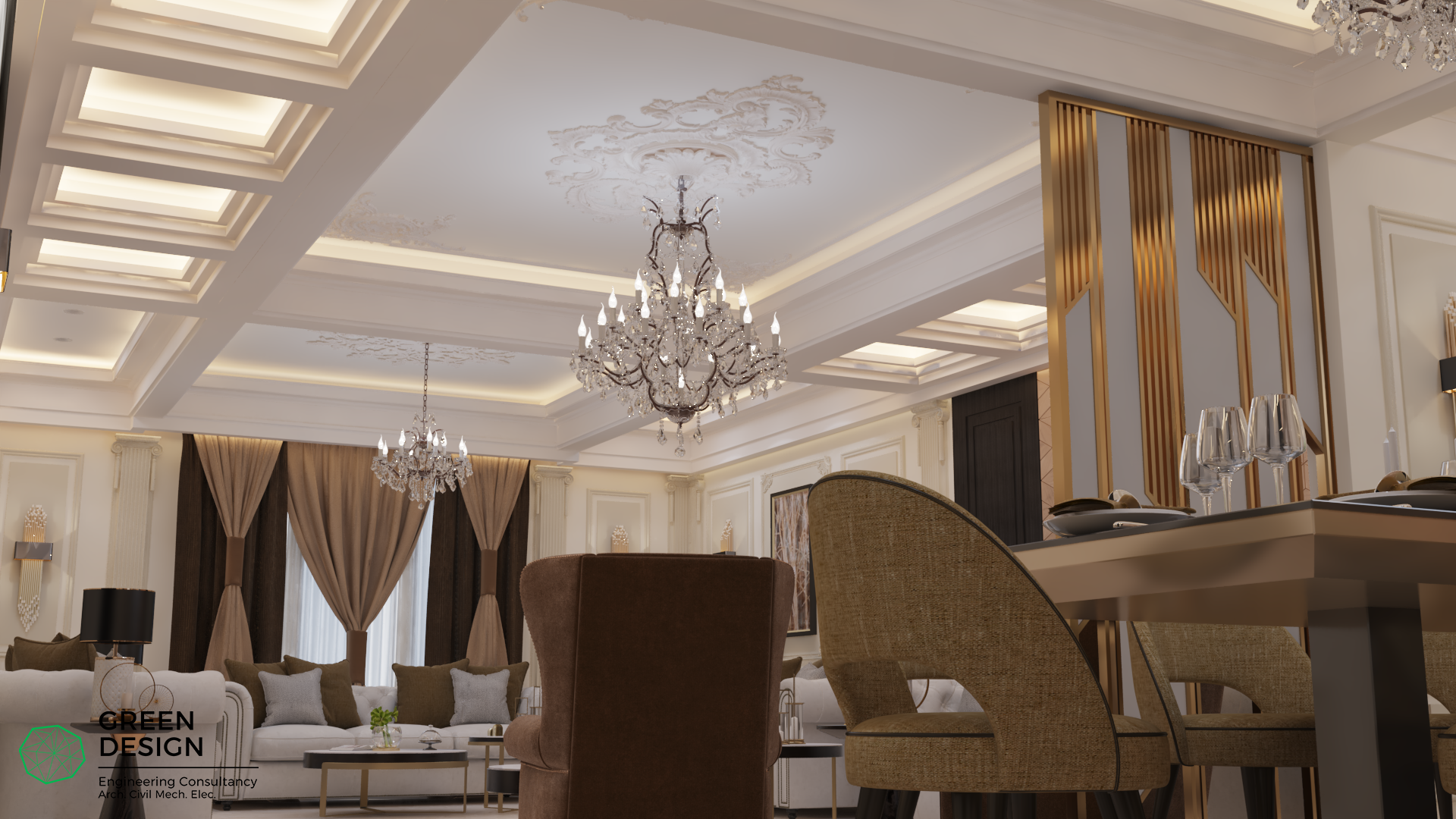 مجلس الضيافة هو من أهم الغرف التي يهتم بها المالك ويريد ان يكون لهذه الغرفة تصميم مميز يجمع ما بين الفخافة والابداع. وبناء على رغبات المالك التي تم تحديدها فقد رأى مهندسي مكتب التصميم الأخضر أن طراز نيوكلاسيك هو الأفضل